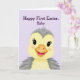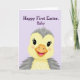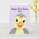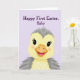 This card features a sweet, stylized baby bird centered in the lower two-thirds of the design, facing forward in a balanced pose against a pale lavender background 🌷. Its downy body is soft yellow with gentle gray tufts on the head and along the wings, giving it a cuddly, youthful look. Large glossy black eyes with fine lashes and a faint blush on the cheeks create a tender, affectionate gaze, like it’s leaning in to greet someone close. The bright orange beak is open in a friendly smile, showing a rosy-pink mouth that adds to the warm, welcoming expression. The feather textures are lightly detailed, making the character feel soft and huggable without looking busy. Near the top, the message “Happy First Easter. Baby” is placed above the bird in purple lettering, standing out clearly against the light background 🐰. The overall scene stays simple and cozy, with the bird as the main focus and plenty of open space around it. The lavender backdrop remains smooth and uncluttered, with the purple text floating above the fluffy yellow bird.