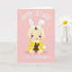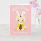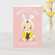 This card shows a stylized baby centered on a soft pastel pink background, dressed in a sunny yellow romper with a white collar and matching cuffs, plus a little fluffy tail at the back for a spring-animal look 🐰. A white headband with tall ears sits on the baby’s head, and the rosy cheeks and wide dark eyes add a tender, affectionate charm, like the baby is sharing a sweet moment with someone close. A tiny tongue peeks out from a small smile, giving the face a curious, friendly expression. In the baby’s hands is a small dark-brown, simplified woodland animal figure, held close as if it’s a dear little companion 🐇. Curved text in rounded white lettering sits above the illustration, framing the baby’s head and ears. A second line of matching white text is placed below the baby, centered near the lower portion of the design. The yellow outfit contrasts softly with the pink background, and the white details—collar, cuffs, headband, and lettering—stand out neatly around the central figure.