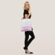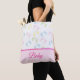 All purpose baby diaper tote bag, with a colorful pastel baby foot print pattern, on the top half of the bag, and solid pink, on the bottom. Baby in custom bright pink text is ready to personalize to read what you want.