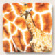 A painting of a baby giraffe up-against it's parent's belly. It has a lot of growing to do to catch up to the size of it's mom and dad.