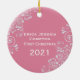 Sweet baby girl's first Christmas photo ornament done in pink on the back with white flourishes and white custom text. The front is ready for your baby's photograph accented with lovely white flourishes. Great way to commemorate your child's first Christmas, and great gift idea for the grand parents.