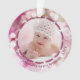 Commemorate a baby girl's first Christmas with this double-sided keepsake ornament featuring a pink and white bokeh background and a raspberry pink "stitched" ribbon accent around a photo on the front and another on the back with a place to add your personalized text on both sides. Change or delete the text as desired. The text font style, size and color can be changed as well by clicking on the CUSTOMIZE tab. (PHOTO TIP: For fastest/best results, choose a photo with the subject in the middle and/or pre-crop your image to a square shape BEFORE uploading. Contact the designer via Zazzle Chat or makeitaboutyoustore@gmail.com if you'd like this on another style ornament or other product.