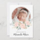 This design features a girl birth newborn photo simple birth announcement, with a newborn photo welcome parents template, a minimal minimalist typography stats, a baby girl pregnancy cards, an elegant calligraphy script pink floral, botanical pink roses watercolor greenery, a baby girl photo birth announcement, a chic pink green flower leaves, a baby photo picture photography, a cute sweet baby girl announcement