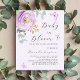 A soft lilac colored background. Decorated with a lilac and purple rose and green watercolored eucalyptus greenery and butterflies. Personalize and add a name and party details. Text: Baby in Bloom.