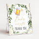 This design features watercolor greenery with a beer and baby bottle and gold foil accents.