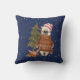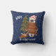 "BABY it's cold outside" declares the front of this cute throw pillow. A bewildered bear in a ski sweater and red and white striped Santa hat holds a lantern while snow falls around him. At his feet lies a little red fox snuggled in a wrap. A green pine tree is in the background. The back of the pillow has the same image, but without the text.