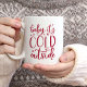 Festive holiday mug features the quote "baby it's cold outside" in red hand lettered typography accented with wintry snowflakes.