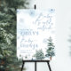 Winter Wonderland baby shower welcome sign with blue snowflakes and pine trees.