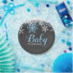 Boy winter themed baby shower paper plates. This cute design features blue and white snowflakes on a chalkboard background.