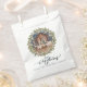This traditional Christmas favor bag features a nativity image of baby Jesus sleeping in a manger with Mary and Joseph in the center surrounded by a berry wreath. Below are the words "Merry Christmas." You can personalize with your name.