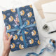 This adorable wrapping paper has a pattern of a baby lamb on a crescent moon. There are also clouds and stars and the background is a pretty blue.