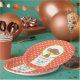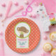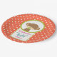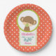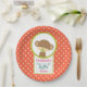 Baby shower paper plates. With a cute baby monkey holding a pacifier in his mouth Inside a circle with an olive green border. The background is an orange and white polka dot pattern. The letters in the word baby are hanging down from a boho style arrow. Personalize with your guest of honor's name.