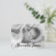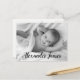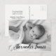 Personalized with baby's photo on the front and special message on the back. This design uses an elegant script handlettering style font for baby's name for a touch of sophistication. Express your excitement in announcing the birth of your child and send your gratitude at the same time.
