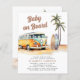 Cute budget surfing-themed baby shower invitation adorned with watercolor beach scenes, a vintage orange van, palm trees, sandy shores, and teal and brown surfboards, and "Baby on Board" in a fun retro brown script. Add the mother-to-be's name and shower details in simple modern lettering. This budget semi-gloss paper is similar in weight to photo paper. A larger 5x7 traditional card stock version is also available (message us for the link).