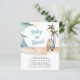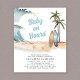 Cute budget surfing-themed baby shower invitation adorned with watercolor beach scenes, breaking waves, palm trees, sandy shores, and vibrant teal and brown surfboards and "Baby on Board" in a fun retro blue script. Add the mother-to-be's name and shower details in simple modern lettering. This budget semi-gloss paper is similar in weight to photo paper. A larger 5x7 traditional card stock version is also available (message us for the link).