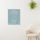 A boy baby shower "baby on board" theme featuring white line art with sun, waves, island, palm trees, and surfboard. White text and border. Background is blue.