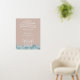 A girl baby shower "baby on board" theme featuring white line art with sun, waves, island, palm trees, and surfboard. White text and border. Background is pink.