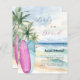 An elegant invitation for a Gender Reveal Party. A watercolored sandy beach, ocean waves and palm trees as background, and a blue and a pink surfboard on the beach. For a gender reveal or expecting twins.