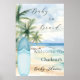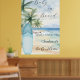 A welcome sign for a Baby Shower, celebrating a baby boy. A watercolored sandy beach, ocean waves and palm trees as background, and a blue surfboard on the beach.