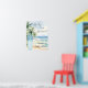 A welcome sign for a Baby Shower, celebrating a baby boy. A watercolored sandy beach, ocean waves and palm trees as background, and a blue surfboard on the beach.
