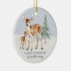 Celebrate the joy of a new arrival with this customizable Christmas ornament that features a beautiful watercolor illustration of a doe and fawn with a simple evergreen tree on a backdrop of freshly falling snow. The front of the ornament features customizable text that says, “Baby Reindeer on the Way,” while the back offers space to add a photo, along with the baby’s name and birthdate, to create a truly unique keepsake. This ornament will make a thoughtful gift that will be treasured for years to come, becoming a beloved part of your family’s holiday traditions.