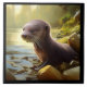 Decorative ceramic tile for wildlife lovers, featuring AI generated realistic digital painting of a cute baby otter playing in a mountain stream. Use in home décor projects or simply display with an easel.
