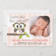 Announce the arrival of your sweet baby girl with these adorable owl baby announcements with a green and brown owl perched on a tree branch wearing diapers with a pink diaper pin on a pink and white stripe background on a fluffy cloud day. Artwork © Chrissy H. Studios, LLC. All Rights Reserved.