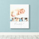 Baby photo collage wrapped canvas with personalized text and zigzag picture strip. The template is set up ready for you to add five photos - the main photo will be used as the background and the remaining 4 photos will be laid out in a zigzag picture strip along the bottom. This design has a white background, fine grey photo frames and elegant grey typography.