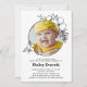 Floral naming ceremony invitation in a black and white design with a photo of your baby inside a hand drawn flower frame.