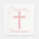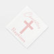 These Baptism celebration napkins feature a white background with a soft, baby pink colored cross in the center. A sample baby girl name is printed at the the top of the napkin, and the word "Baptism" is printed at the bottom in matching pink font. You can personalize it to include your own custom name or message.