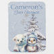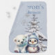 This custom baby blanket features a cute North Pole Winter theme. A cute baby penguin and polar bear cub are standing near a pine tree, beneath falling snow. The background is a soft blue with pretty little white snowflakes. A sample name is printed at the top which you can personalize to include your own custom name or text. It's perfect for celebrating a baby's first Christmas.