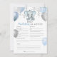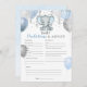 This baby predictions shower game card features blue and gray baby boy elephant with balloons and confetti. Perfect for your guests to play along.