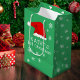 Baby`s First Christmas Green Santa Hat Snowflake Gift Bag. Cute baby first Christmas design with a Santa hat, snowflakes and a baby name in a white script - personalize with your baby`s name.