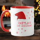 Baby`s First Christmas Santa Hat Snowflake Mug. Cute baby first Christmas design with a Santa hat, red snowflakes and a baby name - personalize with your baby`s name.