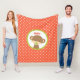 A blanket with a cute baby monkey holding a pacifier in his mouth inside a circle with an olive green border. The word Hello above his head, which can be customized with a name or other text. The background is an orange and white polka dot pattern.