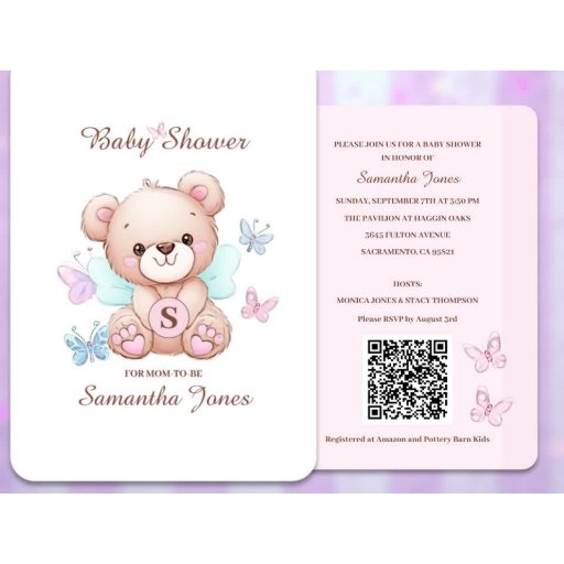 Enhance your baby shower with a custom baby trivia game activity. Guests participate in the trivia to try to correctly answer the questions. Five questions are on the front on the board. The answers are on the back. This is customizable, so adjust or change the text as you choose. Bears & Butterflies design. Use the template to adjust or change the text as needed.