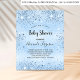 For a baby shower, celebrating a baby boy. A light blue faux metallic looking background. Decorated with faux glitter dust. Templates for the mom to-be's name and party details. The name and the text: Baby Shower are written with a hand lettered style script