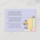 A charming insert card requesting guests to bring a book to the baby shower in lieu of a card. Lavender background with presents and a sweet giraffe peaking from behind. Suitable for either gender baby.