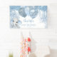 For an elegant Baby Shower. A chic white background. Decorated with faux glitter drips, paint dripping look,glitter dust, blue and silver colored balloons and a baby elephant. Personalize and add the name. Perfect both as a welcome banner or as party decor.
