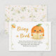 A sweet watercolor Little Cutie baby shower design for a bring a book instead of a card insert with a smiling orange reading a book, white blossoms, sage vines, and a soft background. Perfect for citrus baby showers.
