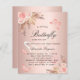 For a modern boho style baby shower. A rose gold gradient background. Decorated with rose gold and pink florals, roses, pampas grass and butterflies. Personalize and add a name and party details.