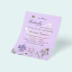 A violet, lavender colored background. Decorated with a large butterfly, bees and painted wildflowers in violet and pink. Personalize and add a name and party details.