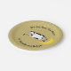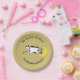 Baby shower paper plates with a cow jumping over the moon. A gold background with light gold confetti. Add the the mom to be name or the parents names.