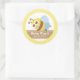 Cute cartoon of a yellow and brown baby bee with a blue pacifier in its mouth, resting peacefully on a brown banner. Honeycomb pattern circle as decorative border. This kawaii and happy design makes it an ideal sticker for labelling the baby showers party favors goodies bag, leaving a wonderful impression with your guests. Background can be changed to your color of choice using the background option under customisation mode. Designed by Rusty Doodle.