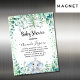 For a baby shower, celebrating a baby boy. A white background. a cute little baby elephant boy and eucalyptus greenery and green sparkles. Personalize and add the name of the mom to-be's name and party details. The name and the text: Baby Shower are written with a hand lettered style script
