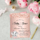 For a baby shower, celebrating a baby girl. A blush, rose gold faux metallic looking background. Decorated with faux glitter dust, and a cute little baby elephant girl. Personalize and add the name of the mom to-be's name and party details. The name and the text: Baby Shower are written with a hand lettered style script