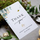 A modern and elegant baby shower thank you card. A chic white background. Decorated with green watercolored eucalyptus leaves, sprigs, greenery and a faux golden sprigs. A cute happy smiling bumble bee. Black text. On the front the text: Thank You, name, and a date.
