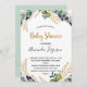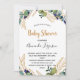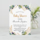 For a Baby Shower. A chic white background. Decorated with eucalyptus greenery and golden sprigs, foliage. Personalize and add a name and party details. Black and golden letters. The text: Baby Shower and the name of the mom to bee are written with a modern hand lettered style script.