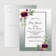 On front: Sage green gradient with a sage green and white frame. Decorated with flowers, roses in burgundy with greenery. Templates for the mom to be's names and party details. The name and Baby Shower are written with a hand lettered style script, black colored letters. Gender neutral.
