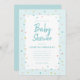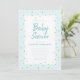 A whimsical baby shower invitation featuring rainbow sprinkles border on a sky blue background.